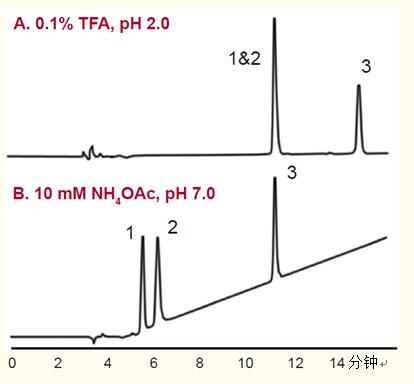 pH值对多肽保留行为的影响。不论采用TFA和磷酸,还是其它离子对试剂,用于多肽分离的反相流动相通常适应的pH值较低。