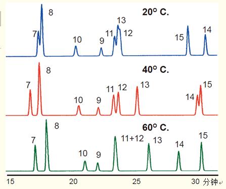 温度升至40℃时会使肽14先于肽15洗脱。
