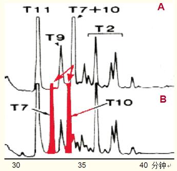 在二硫键被还原的条件下得到的肽图显示了两种肽,分别为T7和T10(图44B)。